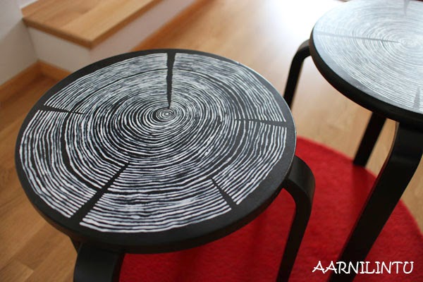 Näistä tuli aika hyvät! Idea on kopioitu tuosta Rings-jakkaran koristelusta, mutta toteutus ja lopputulos ovat omannäköiset. Tämmöisen jakkaran kaveriksi sopisi mainiosti esimerkiksi Design Paletin Vuosirengas-tyyny.